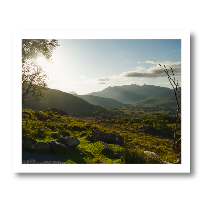 Experience the enchantment of twilight on the Ring of Kerry with the ‘Ring of Kerry: Sunset’ giclée fine art print. This captivating photograph captures the awe-inspiring moment as the golden rays of the evening sun bathe the tall hills and mountains in a warm, ethereal glow. Printed on premium matte paper, it’s a piece that transports you to the golden embrace of this scenic journey.